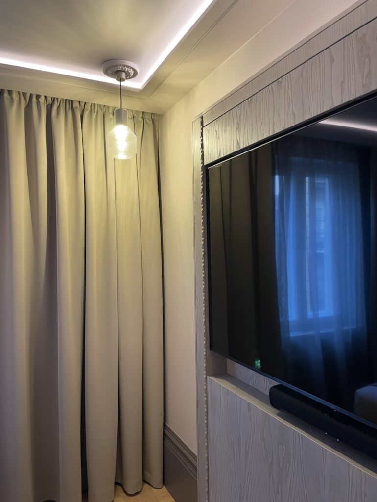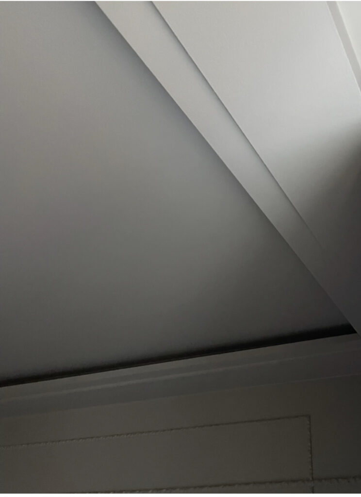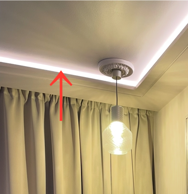 この部屋はライトはおそらくテープライトを使い、クロスでもなくアゴの部分はオーダー建具ですね。しかも段差がついて、デザインされているところが素敵!