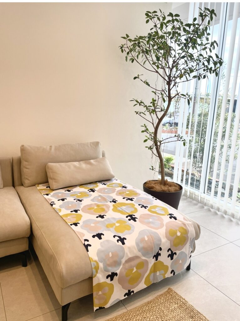 カウニステのこの生地は、1.5Mx1.5M。クッションにしてもいいですし、大判のインテリアパネルにしてもいい。最近の傾向の淡い色使いのインテリアになじみつつ、インパクトもある素敵な空間になること間違いなしです。