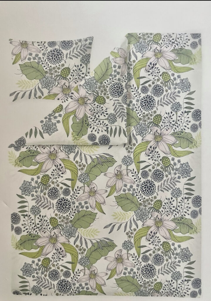 フィンレイソンのベットリネン。淡いピンクとグリーンの配色がベッドルーム全体を優しく包み込んでくれます。大きな柄ですが、色調が穏やかなので主張しすぎません。