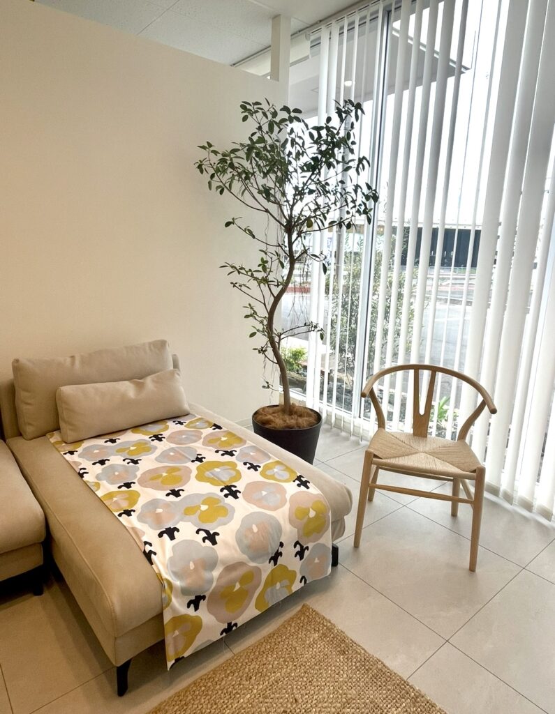 ファブリックパネルとクッションの柄を同じにすることによって、統一感が生まれます。