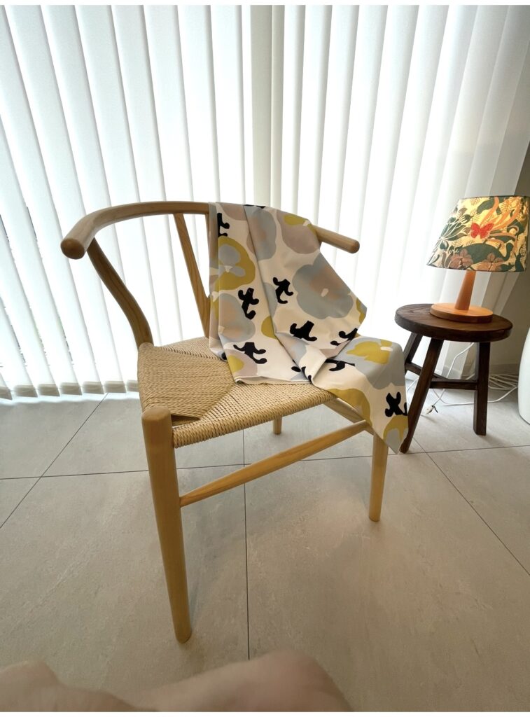 空間に色どりと大きな絵柄がかわいらしくて、一気に北欧の空間に代わります。くすみブルーとグレージュ、そして差し色のマスタードイエロー。